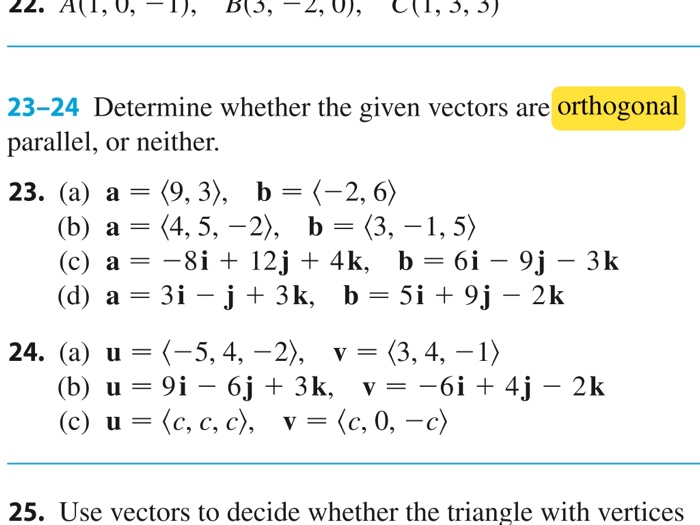 V 12 52 26. Also use the cross product AB AB sin theta to determine orthogonality. We say that two vectors a and b are orthogonal if they are perpendicular their dot product is 0 parallel if they point in exactly the same or opposite directions and never cross each other otherwise they are neither orthogonal or parallel.